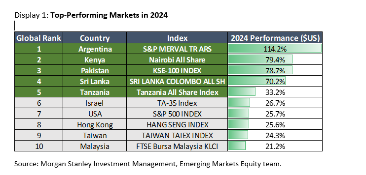 Rather, the five best-performing markets globally in 2024 belonged to the often-overlooked frontier and small emerging markets: Argentina +114% in U.S. dollar terms, Kenya +79%, Pakistan +79%, Sri Lanka +70% and Tanzania +33%.